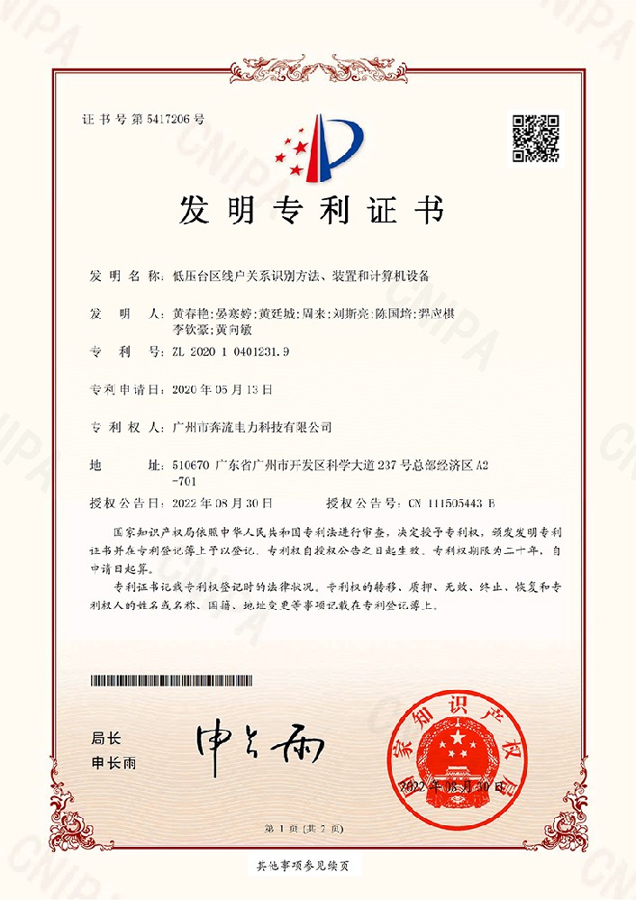 台区相户关系的可信度检测方法、装置和计算机设备-发明专利证书